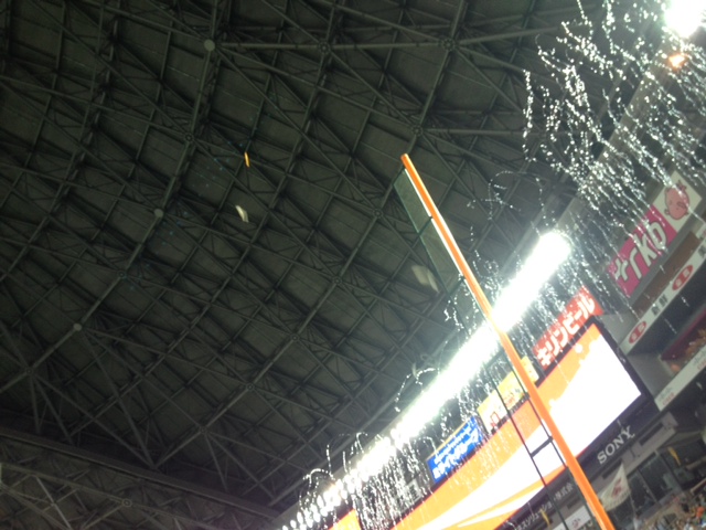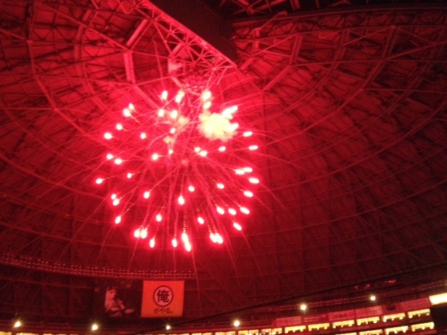 ちなみにこの花火はドームの天井から花火師さんが打ち下ろしてくれているものなんです。打ち上げではなく打ち下ろすというのが少し変わっていますよね。ヒーローインタビューの時に天井を見上げると花火師さんが物陰にいます。
