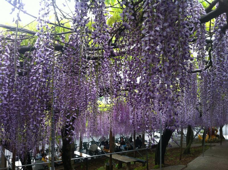 近くについたら藤の甘~い香りがひろがり、藤棚中に入ると、たくさんの観光客で賑わっています。藤から垂らし紫、白、ピンク色よりどりの藤の花が咲き誇り、大きい蜂も周りに舞っています。下でピクニックされている人もベンチに休憩されている人もあっちこっちにいました。